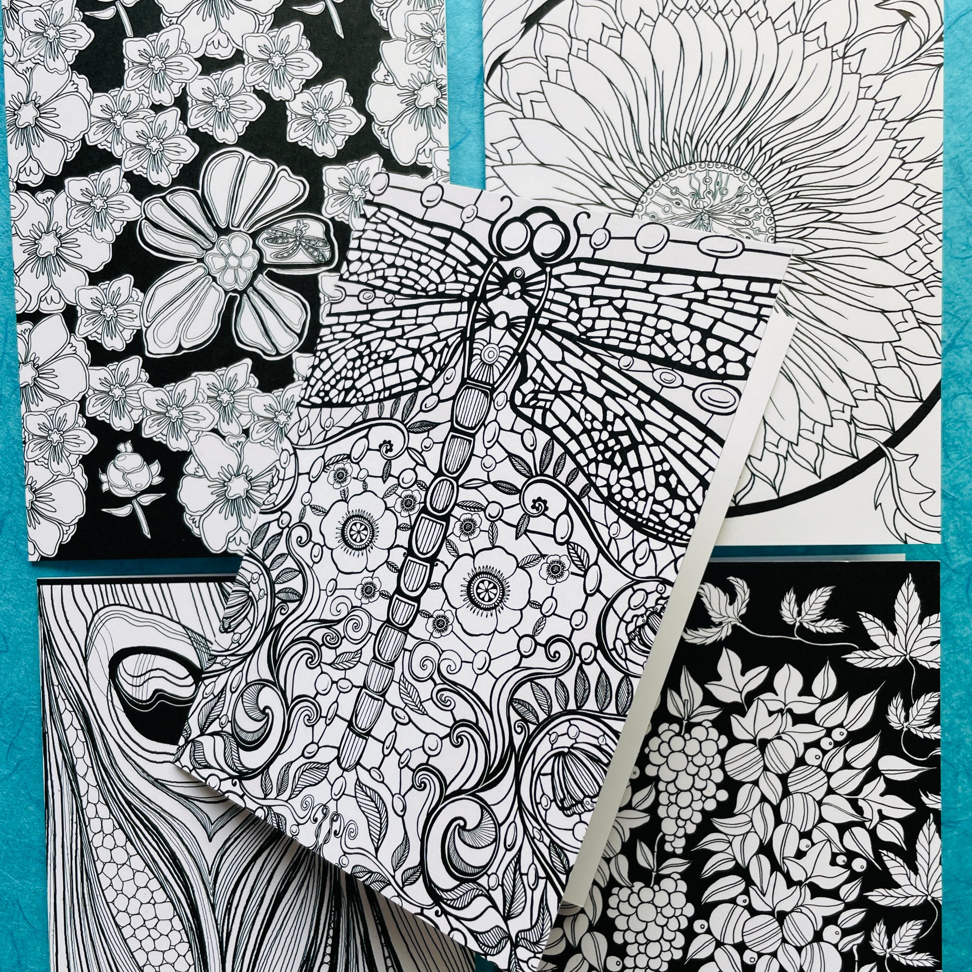 A set of five black and white greetings cards designed by Jessica Palmer. The cards can be coloured in. The inside is blank for your own message.
