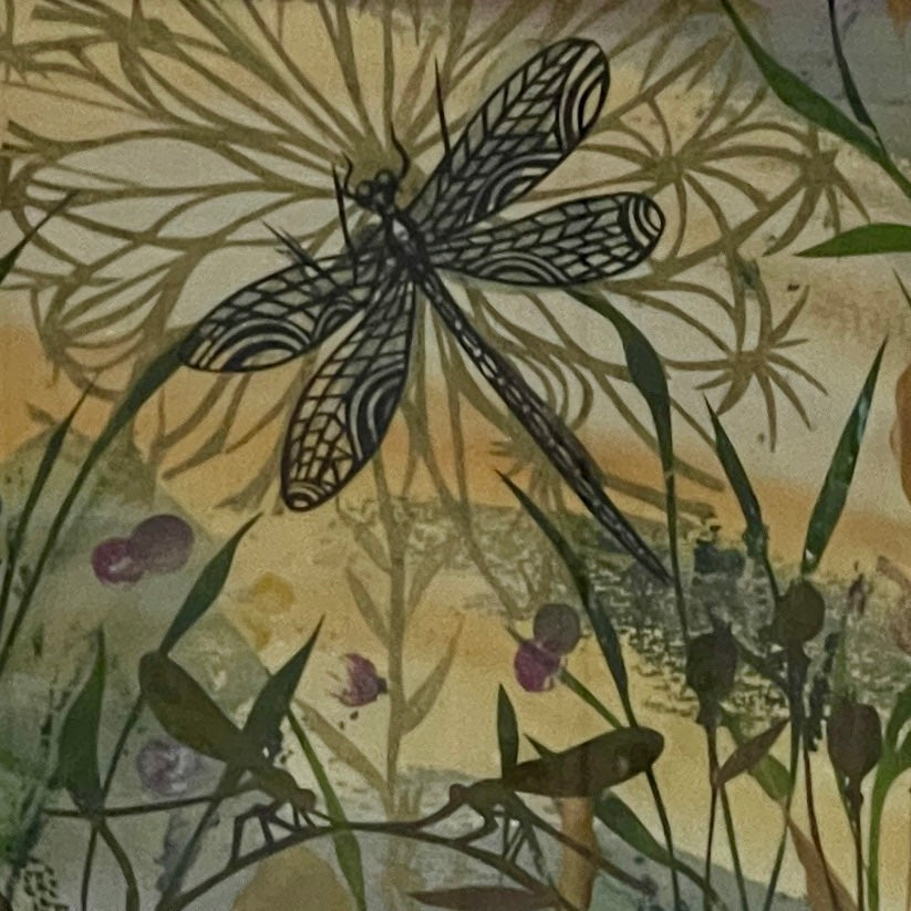 In the understory of a late Summer meadow, a dragonfly dances on a seed head and two damsel flies balance on a blade of grass