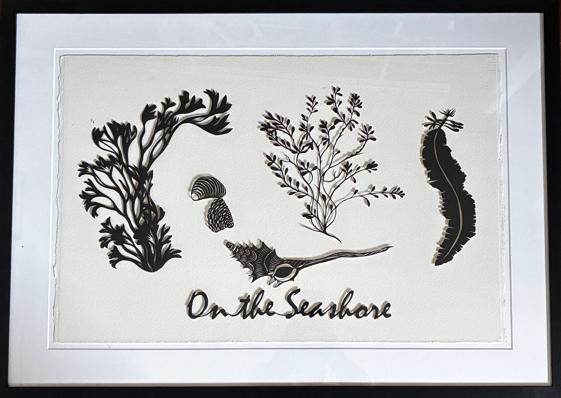 Hand-cut papercut of various seaweeds mounted on watercolour paper 75 cm x 52 cm