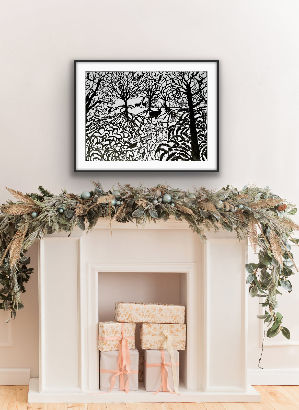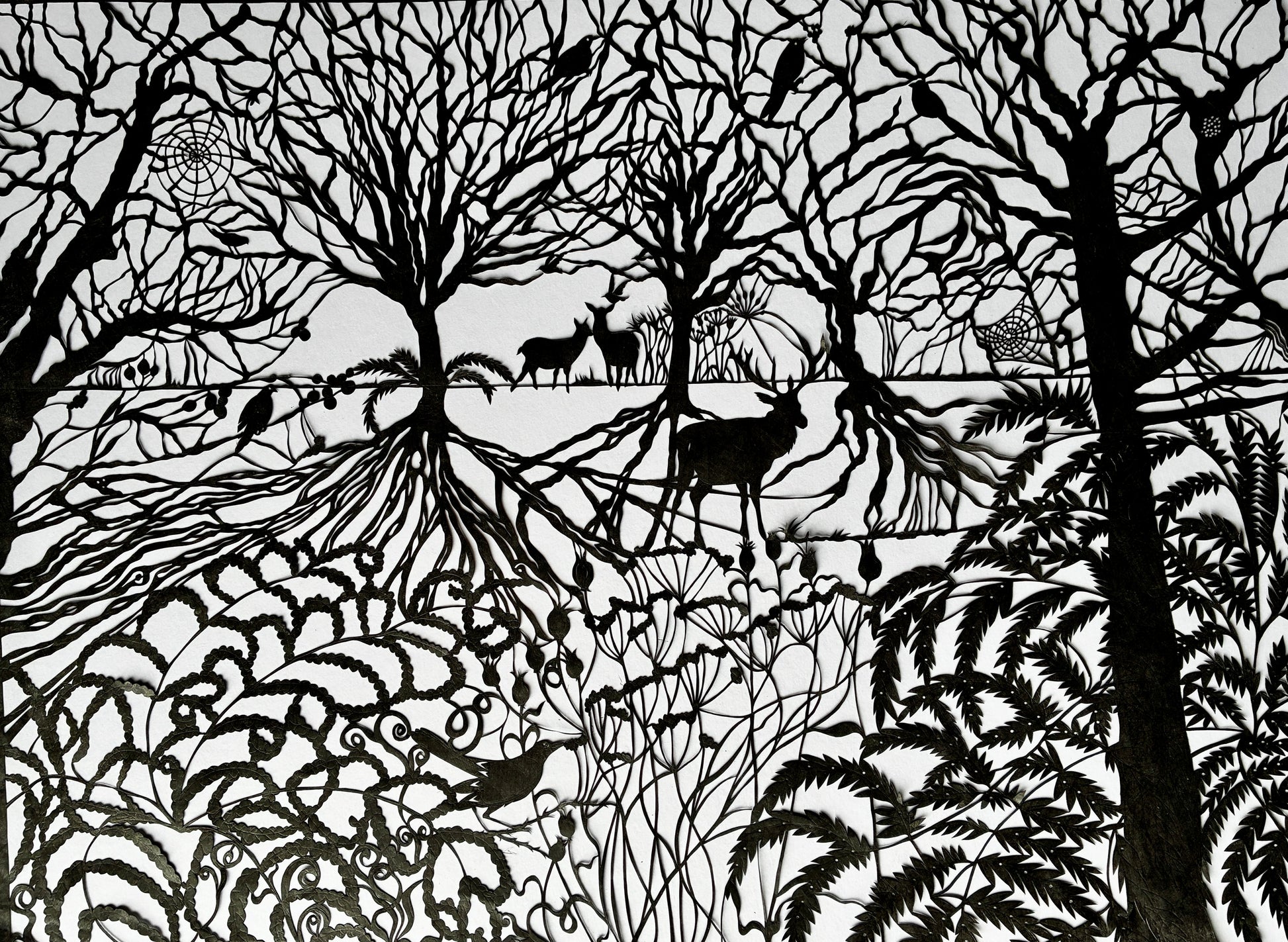 A papercut of a scene with deer in Richmond Park in winter. 50 x 65 cm. Unframed.