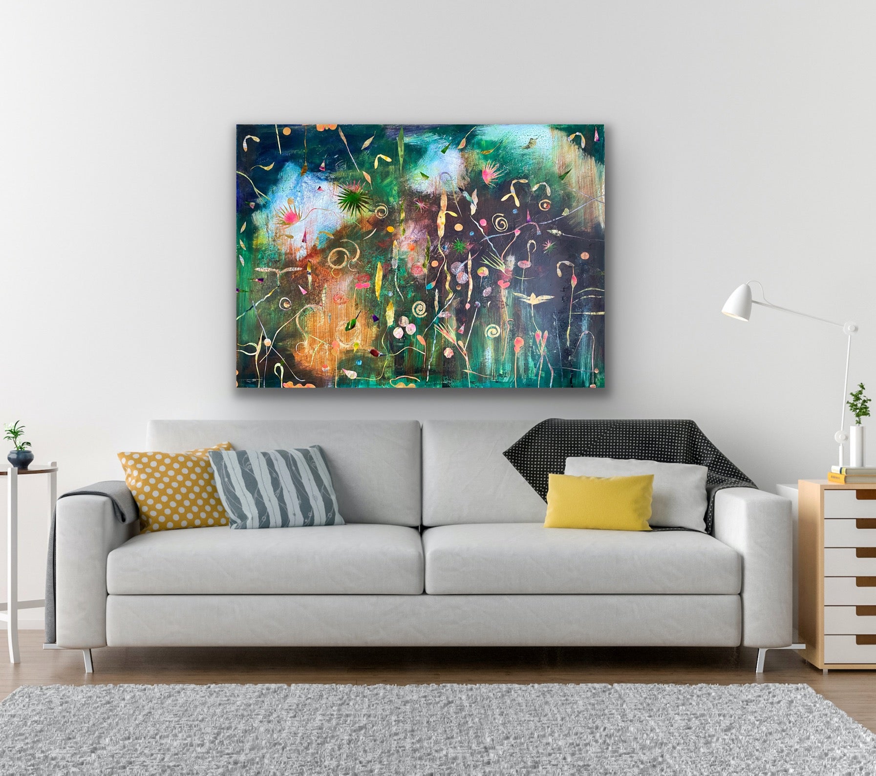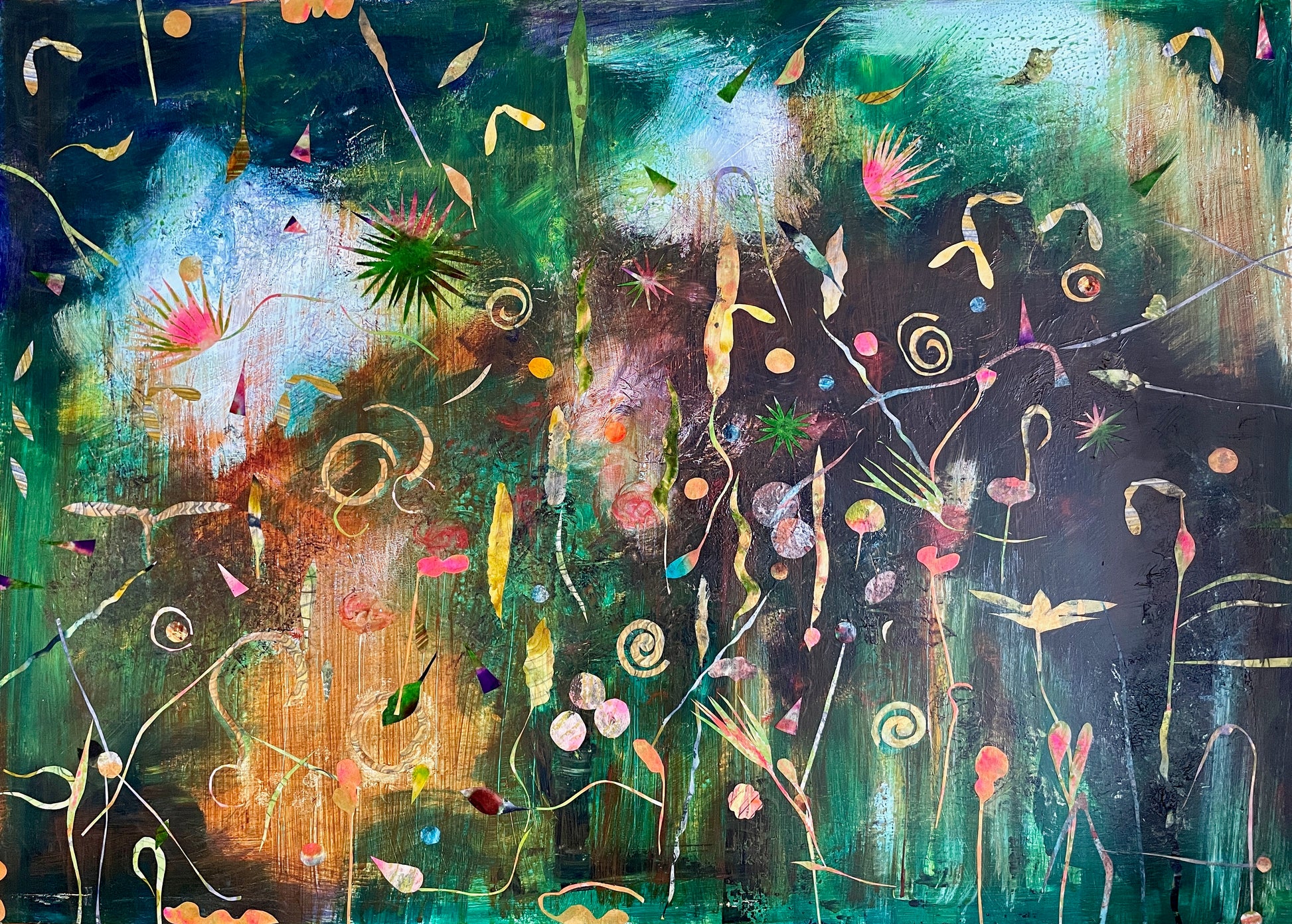 Mixed media abstract landscape collage in green, gold and pink, capturing the firework display of bursting seed heads in the dense undergrowth of a forest.