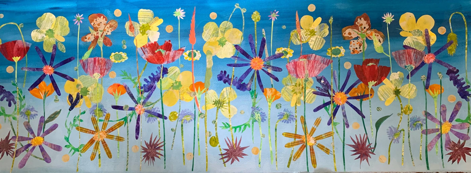 Against a bright blue sky, a rainbow of flowers dance in an abstract meadow