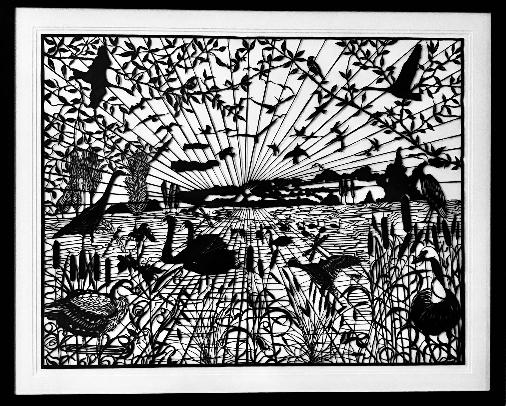 Award-winning large single-sheet, hand-cut papercut mounted on watercolour paper depicting Slimbridge RSPB at sundown 100cm x 80cm