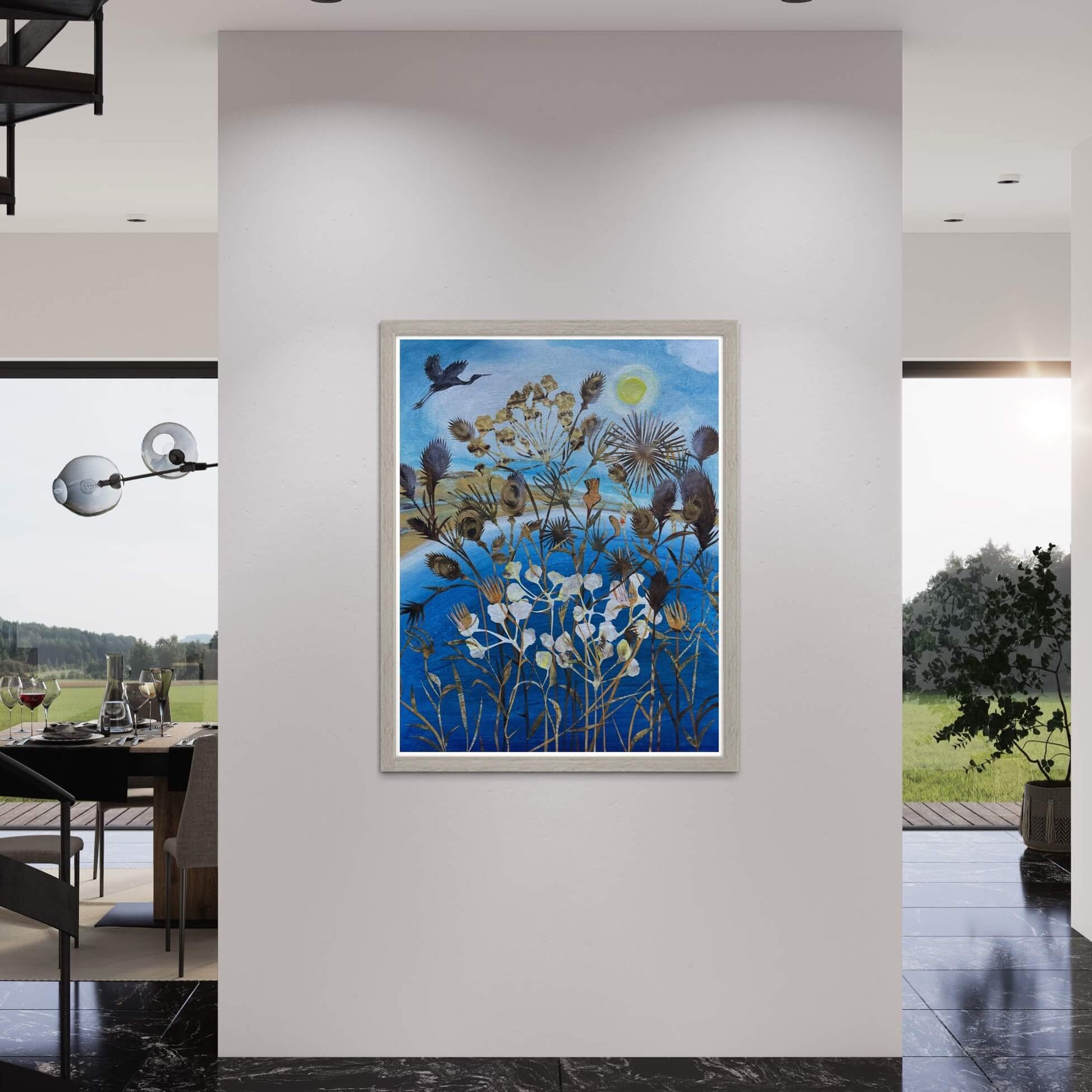 Teasels and seed heads are silhouetted against the blue glow of sea on the Jurassic coast, as a heron rises towards the sun